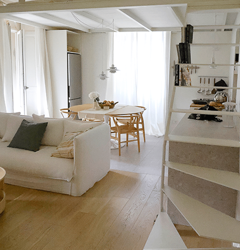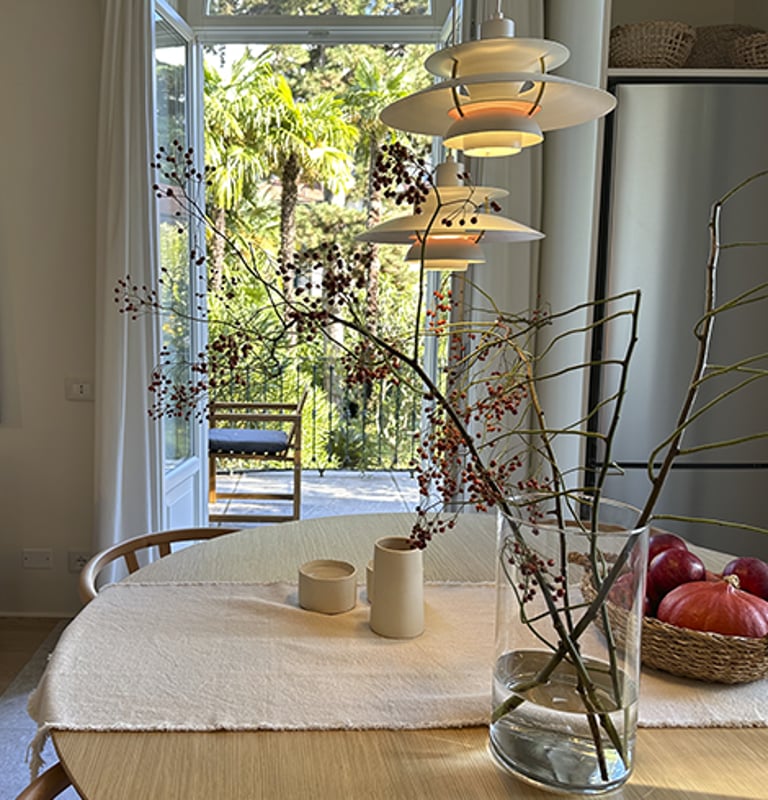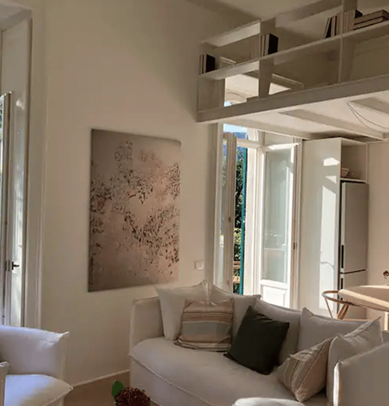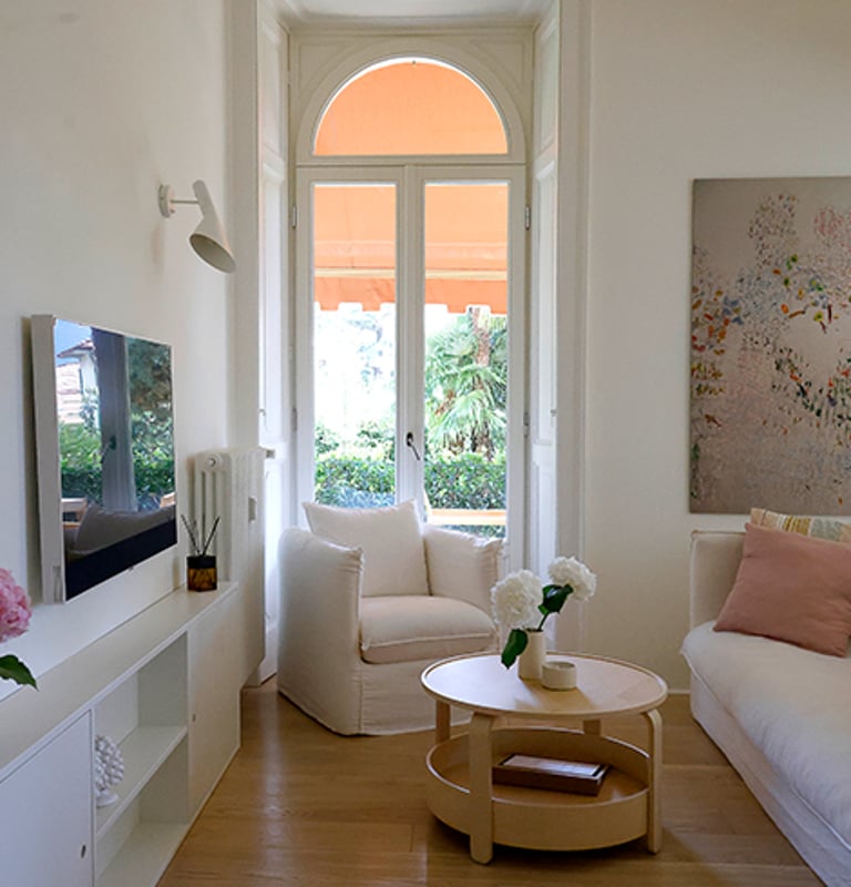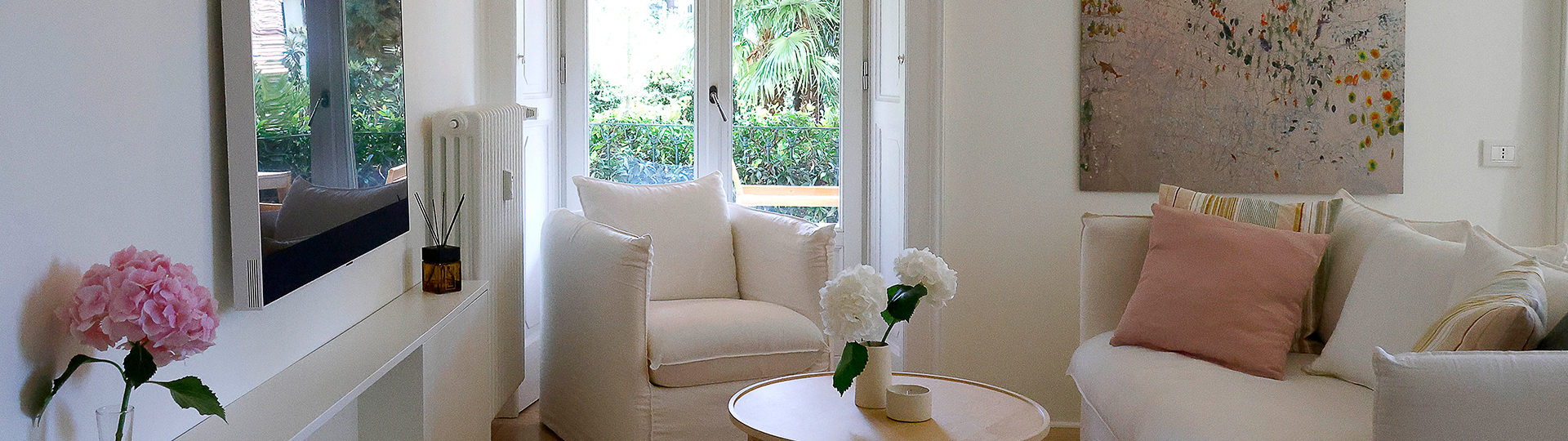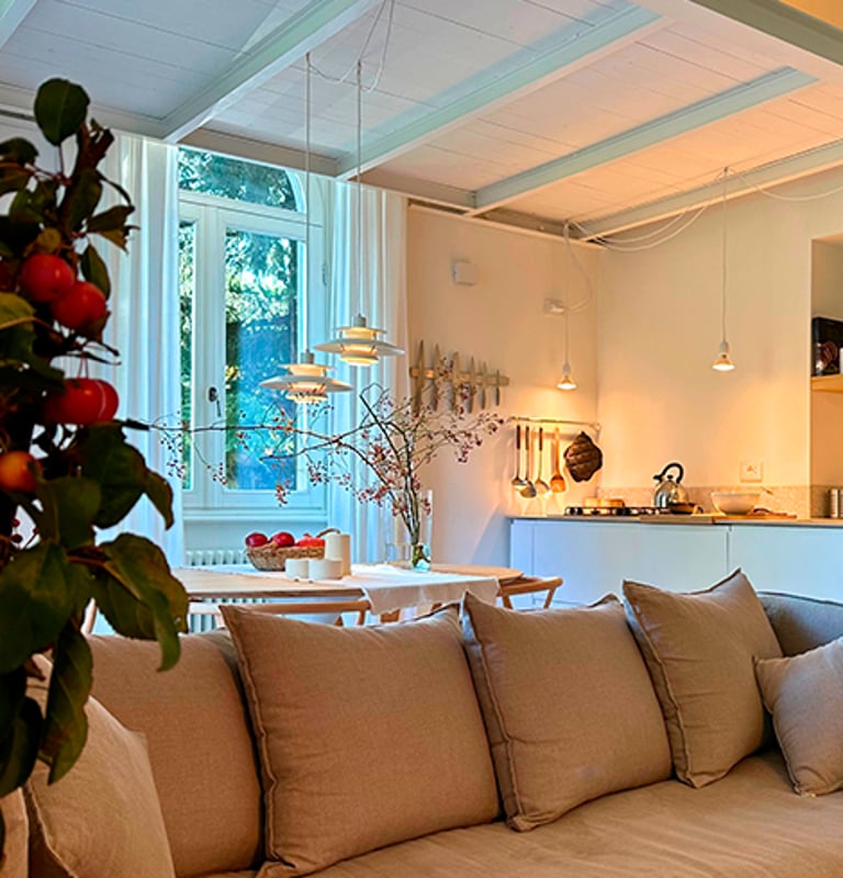 You are welcomed by a large, bright space with two large arched French doors that overlook the beautiful garden of the villa and the terrace. It is a single environment, very welcoming and elegantly furnished, where the kitchen, living room and dining room blend together, creating a very special living area. At Casa Cin life is a continuity between inside and outside with a beautiful natural light throughout the day.
