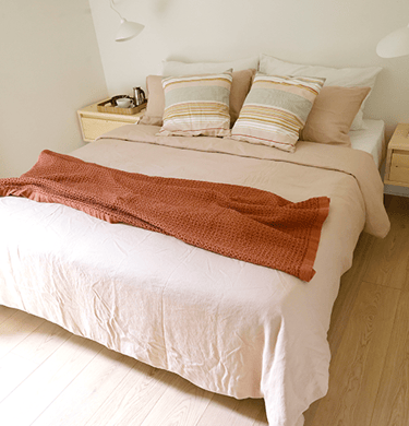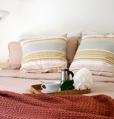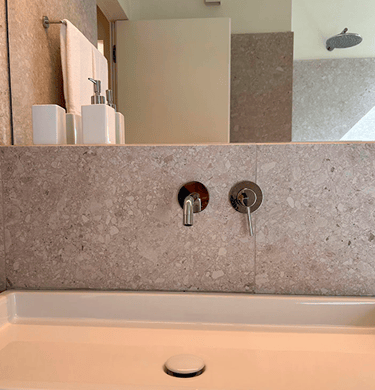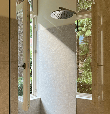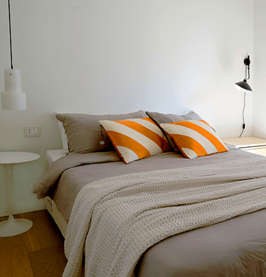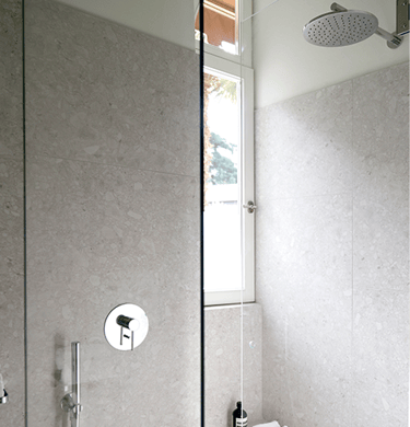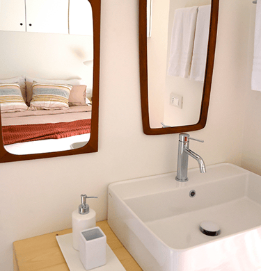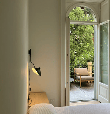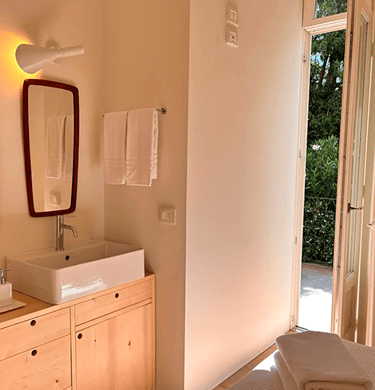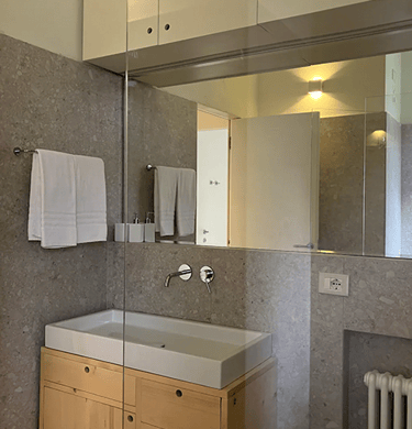The rooms, the pink and gray room, are comfortable and causy. Between the two rooms there is a bathroom with a large windowed shower, all clad with “ceppo di gré”, an ornamental stone typical of Lombardy. In the pink room there is also a vanity sink, which is much appreciated. All the rooms have a ceiling fan.